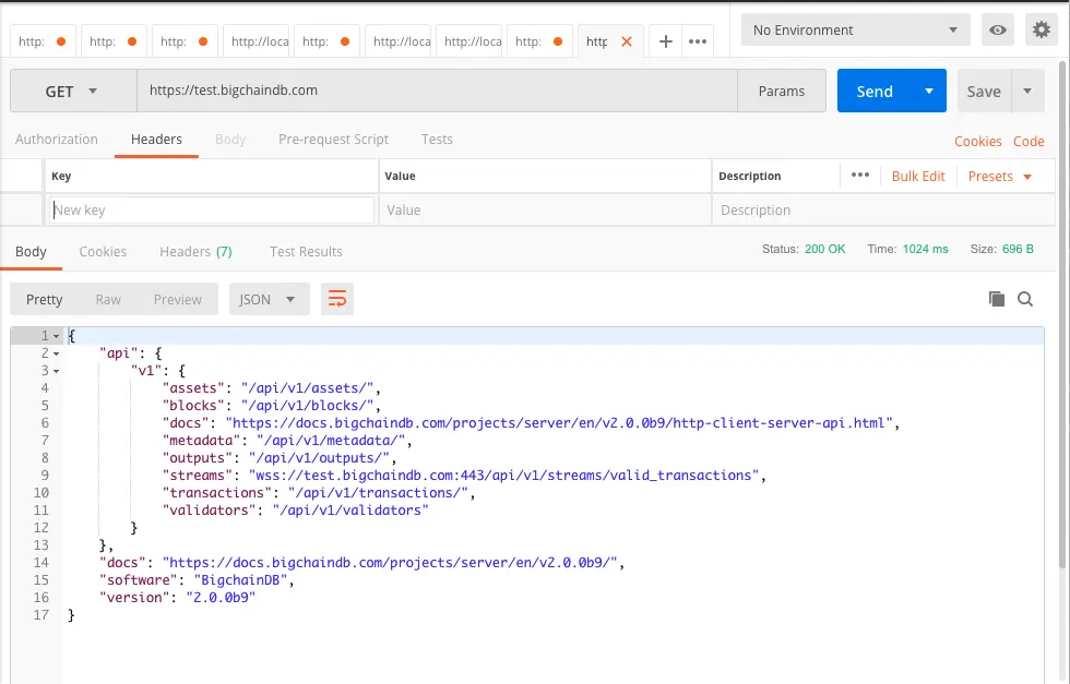 为了方便,这里我们直接使用bigchaindb的测试网络,如果你是自己开发的话推荐自己搭建多节点。 测试网络地址:test.bigchaindb.com,我们用postman请求测试一下,如下图: