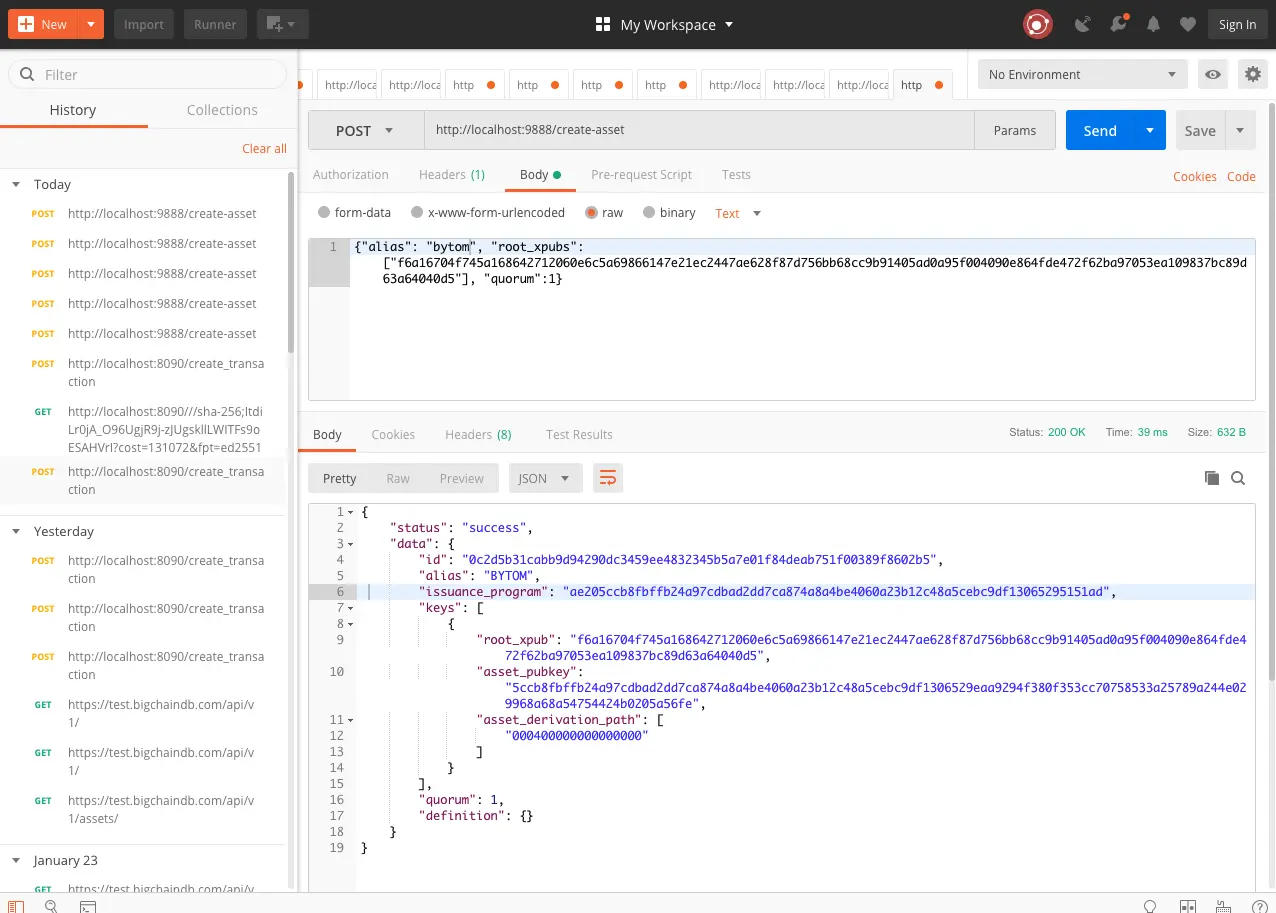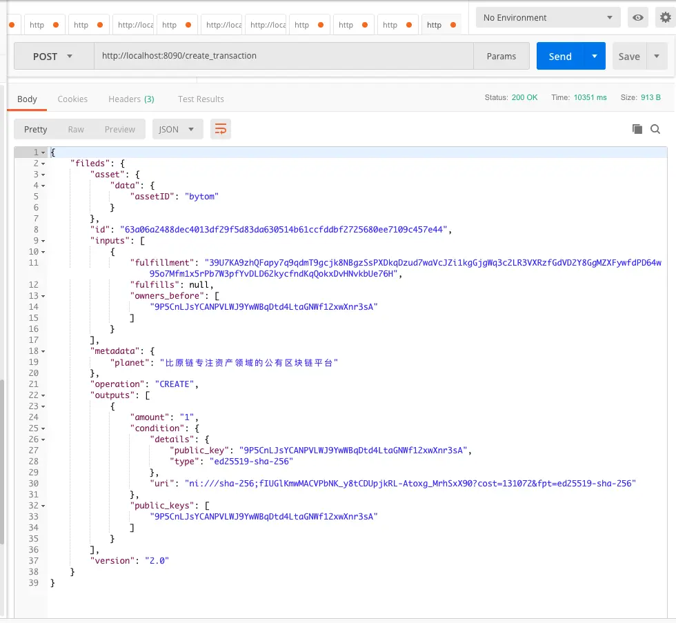 连接好了以后我们在比原上创在一个资产,我们调用create-asset接口:docs.bytom.io/mydoc_rpc_c…。然后创建了资产BYTOM资产,看下图我们已经创建成功了资产。然后我们将这个资产在bigchaindb上去创建并进行交易,如下图: