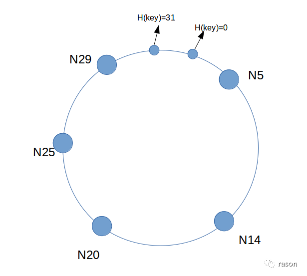 环上的大圆表示机器节点,比如N14 节点负责存储主键经过哈希后落在6~14范围内的键值数据,而N5 节点则存储30~31以及0~5范围内的键值数据。