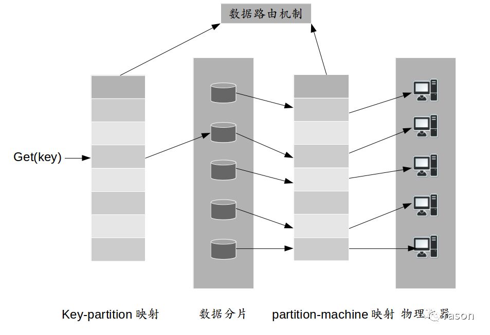 从上面的模型可以看出,Key-partition映射解决的是如何分片的问题,partition-machine映射解决的是分片存储到哪里的问题。这两级映射都是多对一关系,多条记录映射到一个分片,多个分片保存到一台机器。