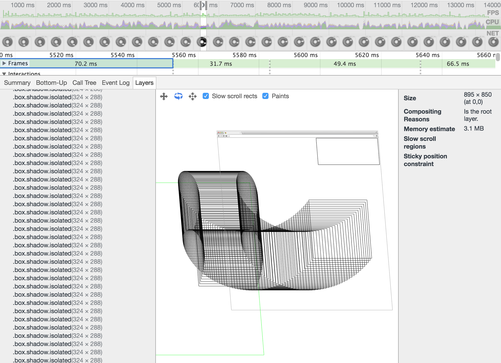 如果想知道浏览器具体创建了多少图层,以及这些图层的具体信息,还可以利用DevTools里这个酷炫的功能。在Preformance面板中点击具体的一帧(标记着时间的那一栏),然后选择Layers标签,可以以3D的方式展示各个图层在浏览器上的位置关系。下面是demo中某一帧的图层信息,数不清的图层组成的螺旋形柱体让我想起了一种小时候玩过的玩具。