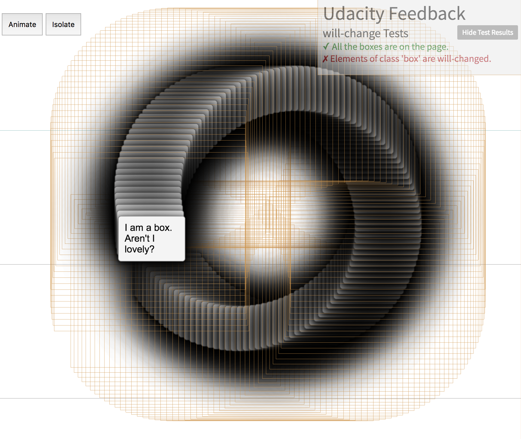 合理地创建图层有时会对页面的渲染速度带来很大的改善,你可以尝试这个来自优达学城的魔性demo来感受到这一点。进入这个网页后,点击左上角的Animate按钮,就会开始循环一段诡异的动画。如果你对自己的机器性能不是很自信,那么建议你马上点击旁边的Isolate按钮,它会为在这些元素增加一个Z轴方向的位移从而为为其各自创建独立图层,以达到避免把你的浏览器卡到崩溃的结果...