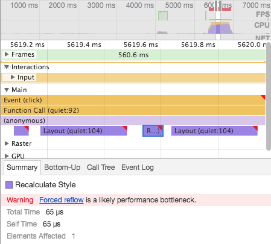在DevTools中我们能看见,对于一个拥有一千个元素的示例来说,重新设置他们的宽度使这一帧的渲染时间达到了560.6ms,在实际场景中这是很难被接受的。好在贴心的DevTools给出了明显的提示,右上角标记为红色的部分就是Chrome认为存在异常的部分,并且贴心地给出了提示: