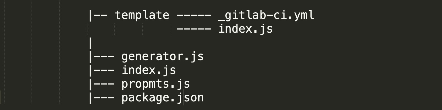 具体的vue-cli插件的开发是怎么样的呢,我写了一个demo,用在模拟多项目的ci模版管理,通常每个项目都有一份.gitlab-ci.yml模版,所以我们一般可以抽出一个公共的ci模版来管理,这里我用cli插件来管理,真正的项目可能不具备可行性,这里我只是用来写一个例子。