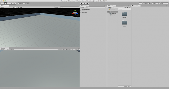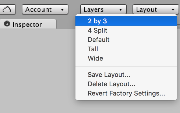 在Scene view视图中查看。 这是一个小型区域,将成为游戏的战场,相机和灯光。 如果您的布局与屏幕截图中的布局不同,请选择右上角的下拉菜单并将其更改为2 by 3。