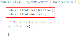 这些是公共变量声明(variable declarations),这意味着这些变量将在Inspector中可见,并且可以调整而无需在脚本和编辑器之间来回切换。