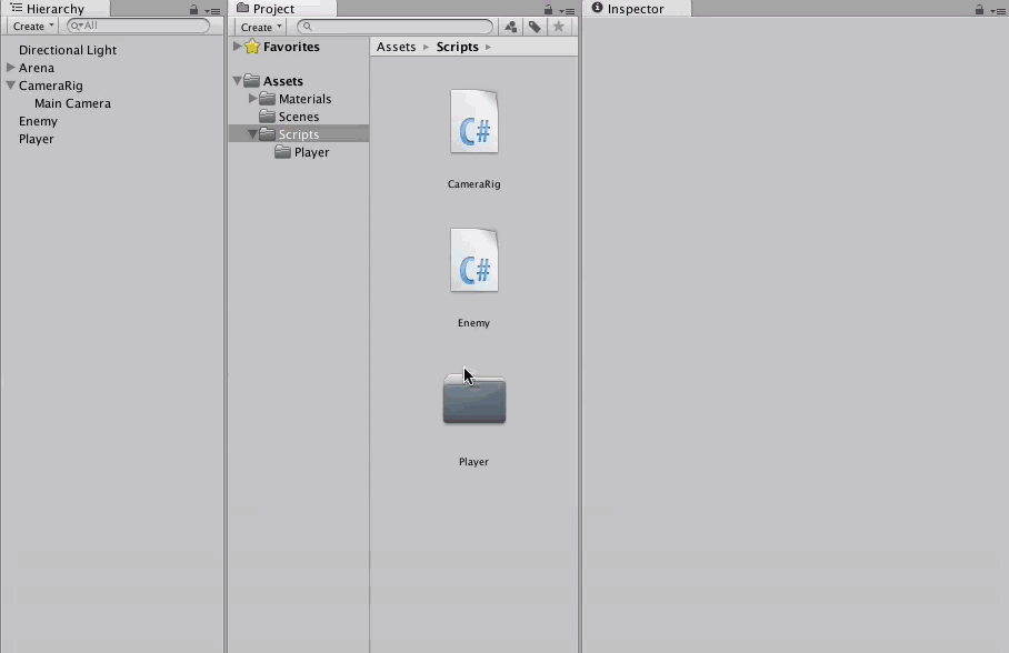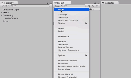 在Project window中,单击Create按钮并选择Folder。 将新文件夹命名为Scripts,并在其中创建一个名为Player的子文件夹。