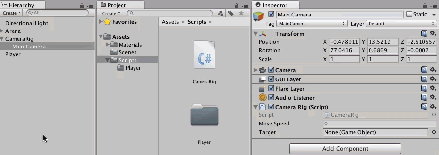 在Scripts文件夹中,创建一个名为CameraRig的新脚本,并将其附加到Main Camera。 需要一些帮助来弄清楚步骤? 您可以查看下面的提示。