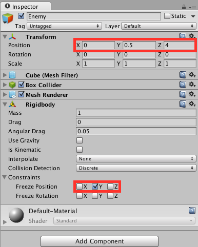 在Inspector中,首先将Cube的Transform设置为(0,0.5,4)。 在Rigidbody组件的Constraints部分中,选中Freeze Position类别中的Y复选框。