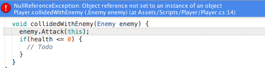 当敌人到达玩家时,它会成功执行攻击并将玩家的健康变量减少到2。但是在控制台中抛出NullReferenceException,指向Player脚本: