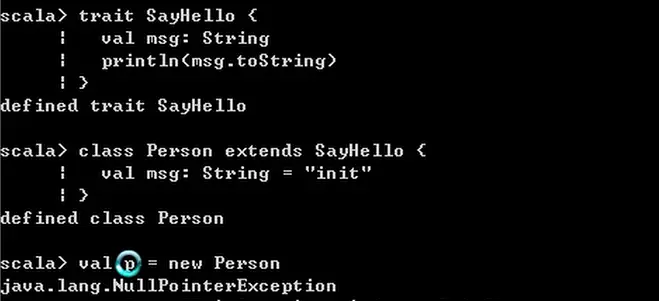 - 在Scala中,trait是没有接收参数的构造函数的,这是trait与class的唯一区别,但是如果需求就是要trait能够对field进行初始化,该怎么办呢?只能使用Scala中非常特殊的一种高级特性——提前定义