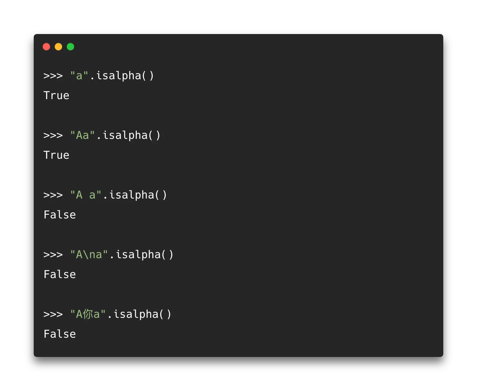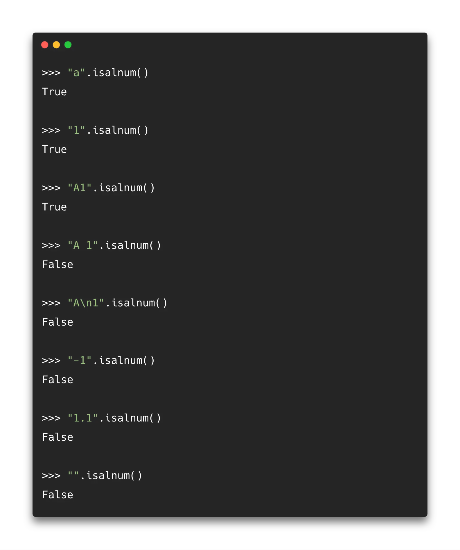 7.isalnum | 判断是否全部为非负整数或字母(即 isdigit or isalpha)