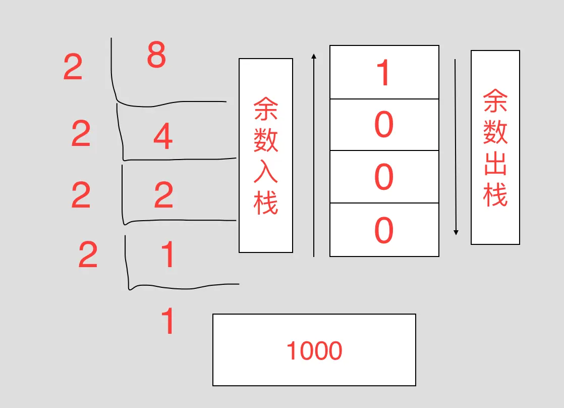 前面介绍了那么多栈相关的知识,最后也是介绍栈的应用场景的时候了,栈的实际应用非常广泛,例如用来存储访问过的任务或路径、撤销的操作。为了有一个更直观的应用了解,下面会介绍如何用来解决计算机中的进制转换问题,将10进制转换为其他进制数,可能不少人已经忘了如何进行进制转换了,下面先来看一个简单的10进制转2进制的过程: