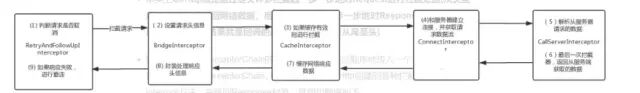 okHttp的拦截器是一个责任链模式,真正的执行网络请求和返回相应结果是通过函数getResponseWithInterceptorChain()实现,通过实现Interceptor.Chain,并且执行了Chain.proceed()方法在拦截器间传递,责任链中每个拦截器都会执行chain.proceed()方法之前的代码,等责任链最后一个拦截器执行完毕后会返回最终的响应数据,而chain.proceed() 方法会得到最终的响应数据,这时就会执行每个拦截器的chain.proceed()方法之后的代码,其实就是对响应数据的一些操作。当责任链执行完毕,如果拦截器想要拿到最终的数据做其他的逻辑处理等,这样就不用在做其他的调用方法逻辑了,直接在当前的拦截器就可以拿到最终的数据。 五大拦截器的主要顺序是:1.负责失败重试以及重定向的 RetryAndFollowUpInterceptor。2.负责把用户构造的请求转换为发送到服务器的请求、把服务器返回的响应转换为用户友好的响应的BridgeInterceptor。3.负责读取缓存直接返回、更新缓存的CacheInterceptor。4.负责和服务器建立连接的ConnectInterceptor。5.负责向服务器发送请求数据、从服务器读取响应数据的CallServerInterceptor。 ![]()
