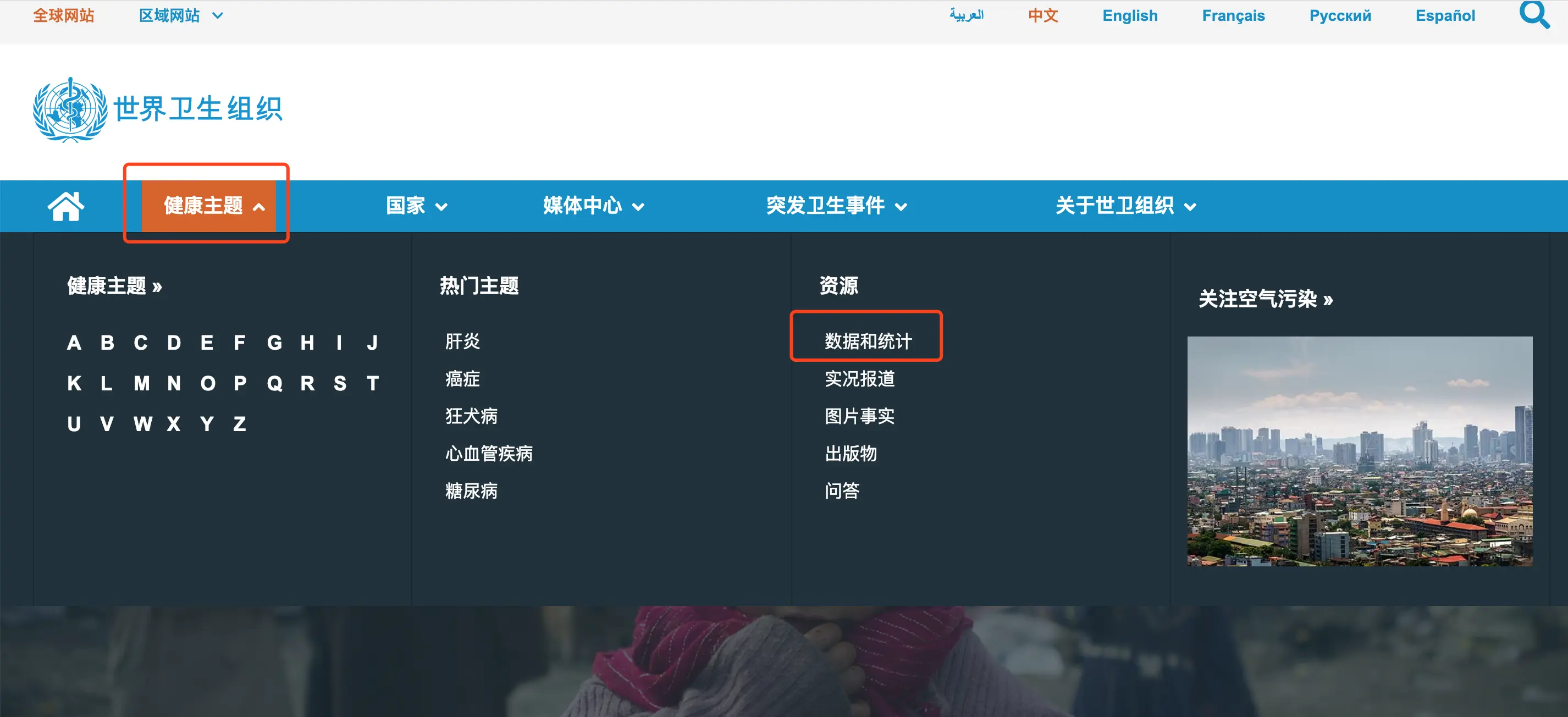 打开世卫组织官网后,点击“健康主题”,“数据和统计” 就能找到很多数据。