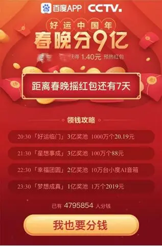 本次百度春晚活动将分成四轮进行,春晚节目中每小时一轮。而今年的百度春晚红包独家合作活动,也是春晚互动红包金额历年来最高的一年!