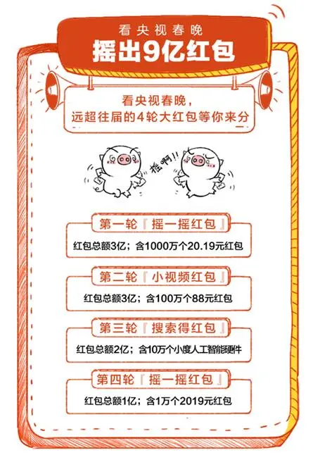 从2月4日除夕夜8点开始,第一轮的主题是好运临门,只要下载百度App在首页摇一摇就可以抢红包啦!本轮一共有3亿元红包,分为随机红包和手气红包两种,光是手气红包就有1000万个20.19元的新年红包哦!