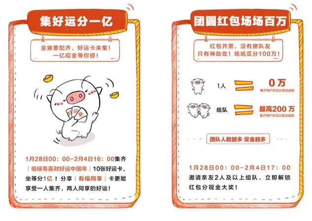 团团圆圆过大年怎么能孤军奋战抢红包?当然是要和家人、小伙伴们抱团战斗啦!从1月28日开始每天都有一场团圆红包活动,场场百万红包,只要和亲朋好友组团就能参加!团队最低两人起,人越多参与的瓜分奖池金额越多,而且是谁攒的局谁的红包越大。