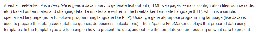 上一篇 <从现在开始,试着学会用官方文档去学习一个技术框架> 提倡大家多去从官方文档学习技术,没有讲到具体的实践,本篇就拿一个案例具体的说一说,就是FreeMarker,选择这个框架没什么特别的含义,最近要用,就拿这个做个典型。