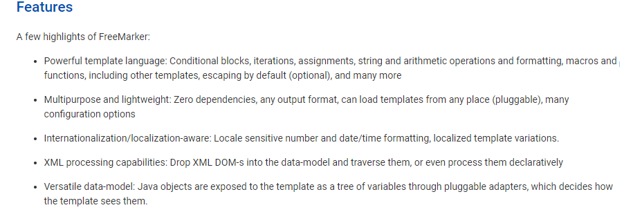 通过解读官方的文档,我们就可以得到以上7个方面的信息。也就了解了Freemarker的作用、基本思想、好处、应用环境,这些东西,相信在很多FreeMarker的教程中,都不会这么详细,而且上面的信息基本上只要你把英文翻译过来都可以直观看到,我并没有做太多总结性归纳。 这是基本内容,首页还标出了一些特性我们再来看一下