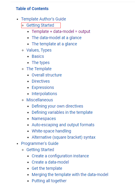 从这里我看看到了Getting Started(开始),大部分的官网都会有Getting Started,点进去看一下,这里要多做一件事,写代码肯定要使用freemarler的jar,我们就从download去拿一下,进到download