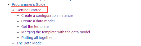 然后看一下它的分类是 Programmer's Guide(程序员指南),那就应该是这里了,点进去看一下,可以看到,除过最后最后的 Putting all together, 其他部分是使用模板的每一个步骤,分为:创建配置实例 -> 创建数据模型 -> 获取模板 -> 合并数据模型到模板,这也是使用freemaker的基本步骤,分步骤的就不看了,我们直接看最后的Putting all together(所有合到一起的内容)