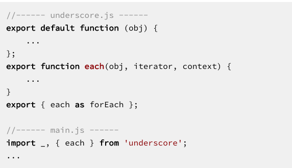 请注意,您不能使用保留字(如 default 和 new )作为变量名,但您可以使用它们作为出口的名字(您也可以使用它们作为属性名称在ECMAScript 5)。如果你想直接导入这样的命名导出,你必须为他们重命名。