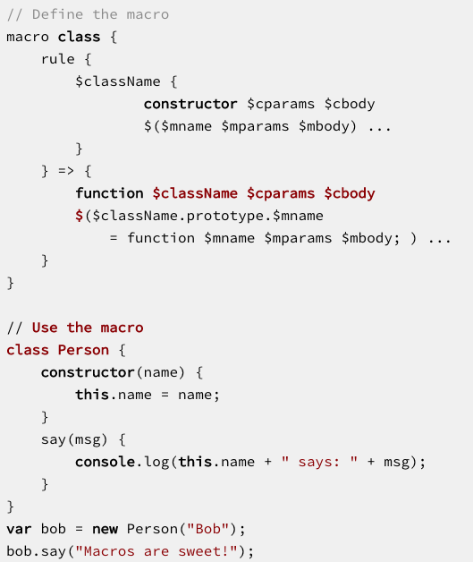 宏仍然在JavaScript的未来路线图上。如果JavaScript引擎支持宏,可以通过库向其添加新语法,sweet.js是一个实验性的JavaScript宏系统,下面是来自The Sweet网站的一个例子: 一个类的宏。