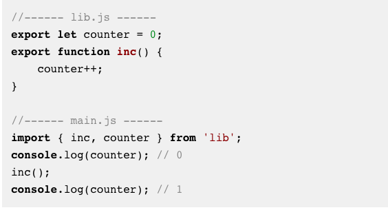 为了消除上述两个限制,ECMAScript 6模块导出是模块的引用,而不是值。也就是说,到模块主体中声明的变量的连接仍然是活动的。下面的代码演示了这一点。