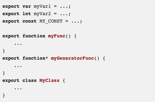 模块可以通过在声明前加上关键字export来导出多个东西。这些导出以它们的名称来区分,称为命名导出