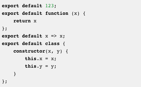 注意: default export 导出的是一个匿名表达式。它将通过模块的名称来标识,如上面两个例子中的myFunc 和MyClass。