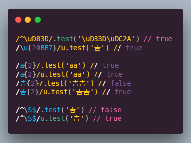 ES6 对正则表达式添加了u修饰符,含义为“Unicode 模式”,用来正确处理大于\uFFFF的 Unicode 字符。也就是说,会正确处理四个字节的 UTF-16 编码。少说废话,看图