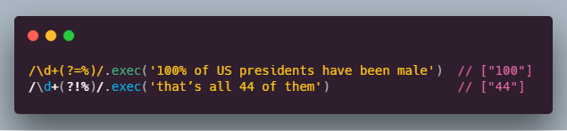 | 先行否定断言 | /want(?!asset)/ | want只有不在asset前面才匹配 |