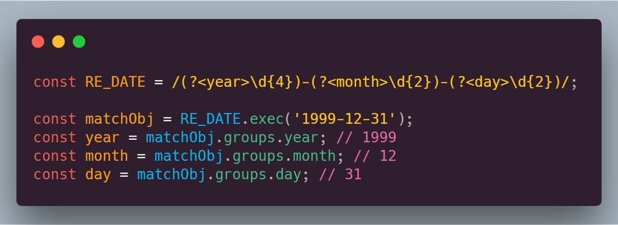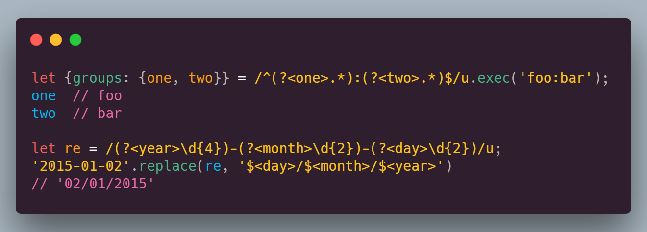 ES2018 引入了具名组匹配(Named Capture Groups),允许为每一个组匹配指定一个名字,既便于阅读代码,又便于引用。