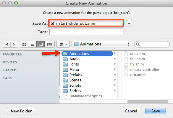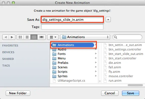 4) 将动画命名为btn_settings_slide_out并将其保存在Animations文件夹中。这也将创建Animation Controller,并将Animator组件添加到btn_settings。