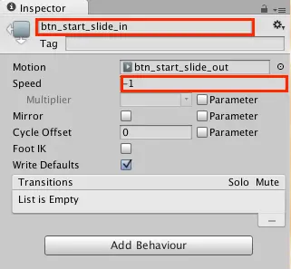 现在,选择此重复状态,可能称为btn_start_slide_out 0,并在Inspector中将其重命名为btn_start_slide_in。 此外,将速度Speed设置为-1。
