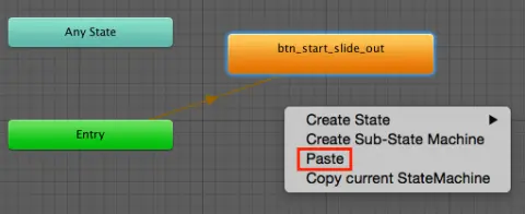 然后右键单击Animator视图内的空闲空间上的某个位置,然后选择Paste。 这复制了btn_start_slide_out状态。