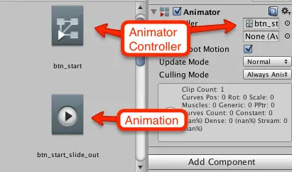 除了创建动画本身之外,Unity还向btn_start添加了一个Animator组件并创建了一个Animator Controller。