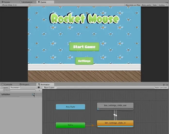 选择File / Save Scenes以保存到目前为止的工作,然后运行场景。 等待按钮停止移动,然后单击Settings按钮。 您应该看到两个按钮同时向相反方向移出屏幕。