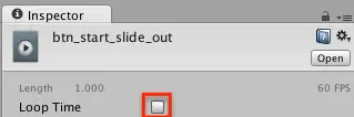 要禁用循环,请在“项目”窗口中打开Animations文件夹,然后选择btn_start_slide_out动画。 在Inspector中,取消选中Loop Time。
