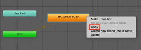 然后在Hierarchy中选择Btn_Start并打开Animator视图。 右键单击btn_start_slide_out状态,然后选择Copy。