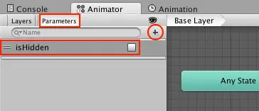 接下来,您需要一个参数来控制按钮的状态。 在Animator窗口的左侧栏中,单击Parameters选项卡。 接下来,单击+按钮并添加名为isHidden的新Bool参数。