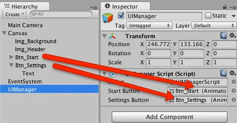 在Unity中,在层次结构中选择UIManager。 将Btn_Start从“层次结构”拖动到“检查器”中的Start Button字段,然后将Btn_Settings拖到 Settings Button字段中。