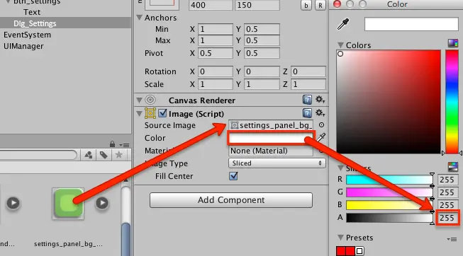 在Hierarchy中选择Dlg_Settings,然后将settings_panel_bg_9slice拖动到Inspector中的Source Image字段。 双击Source Image字段旁边的Color,然后将“A”设置为255以删除透明度。