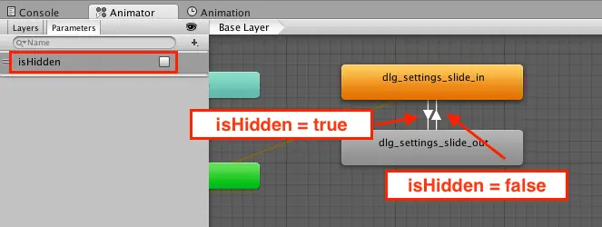 在Inspector中,将状态命名为idle。 接下来,右键单击状态,然后选择Set as Layer Default State。 最后,在idle到dlg_settings_slide_in之间创建一个转换。 将Condition设置为isHidden等于false。