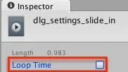 停止录制动画,在“项目”窗口中打开Animations文件夹,然后选择dlg_settings_slide_in。 在Inspector中。 最后,取消选中Loop Time。