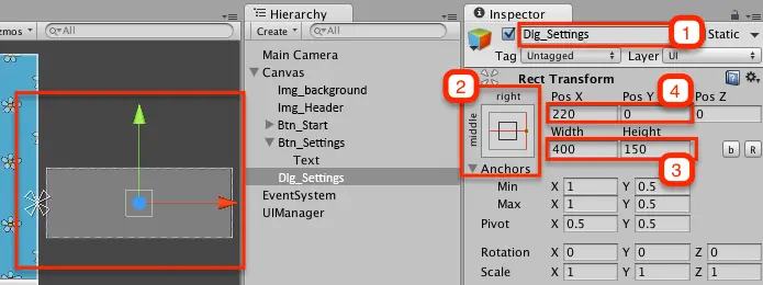anchors设置为middle-right,因为您将对话框定位在右边缘之外且离开屏幕,因此在运行场景时它不可见。 - 3) 将