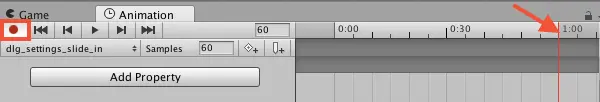 5) 在Animation view中,单击时间轴的1:00标记并确保录制已打开。它应该自动打开,但您可以单击红色圆圈开始手动录制。
