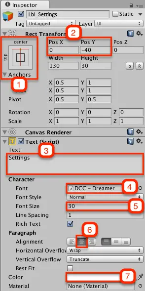 选择GameObject \ UI \ Text以创建新的Text UI元素。 在层次结构中选择Text并将其重命名为Lbl_Settings。 然后将Lbl_Settings拖到Dlg_Settings上,将其添加为子对象。