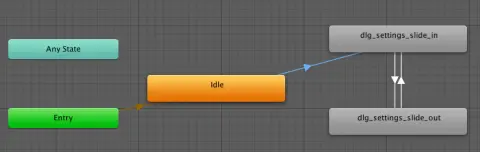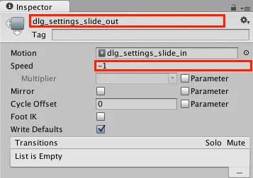 在层次结构中选择Dlg_Settings并打开Animator视图。 复制并粘贴dlg_settings_slide_in状态以复制它。 将副本重命名为dlg_settings_slide_out,并将其Speed设置为-1。